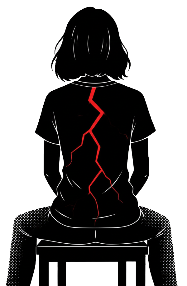 Au fil des pages, un personnage en noir et blanc accompagne le lecteur. On la découvre d’abord enfant, marquée par une fissure rouge — symbole des blessures invisibles laissées par le trauma.